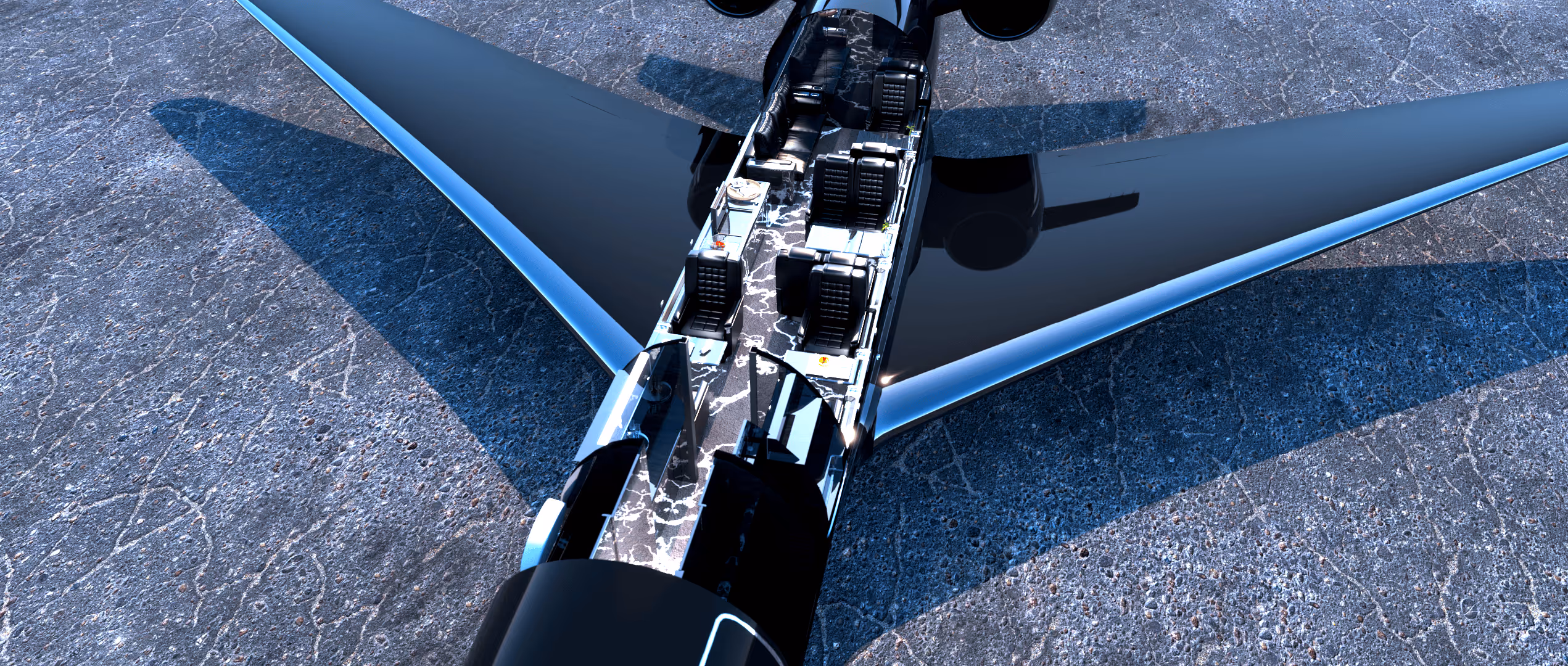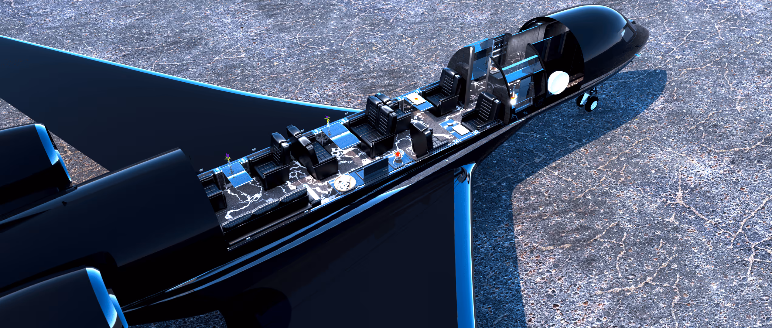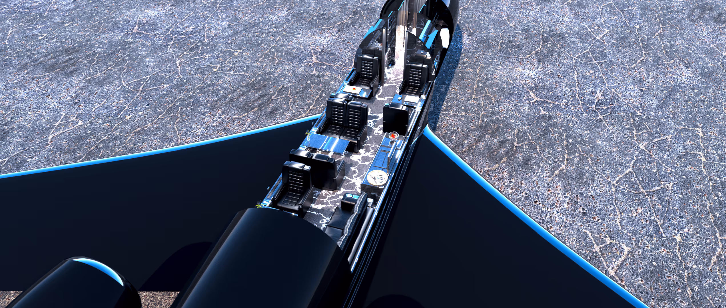 Four-zone cabin,Berthing divan,Full galley,HD monitors,Ka-band Wi-Fi,Wireless AV controls,Lavatory with window