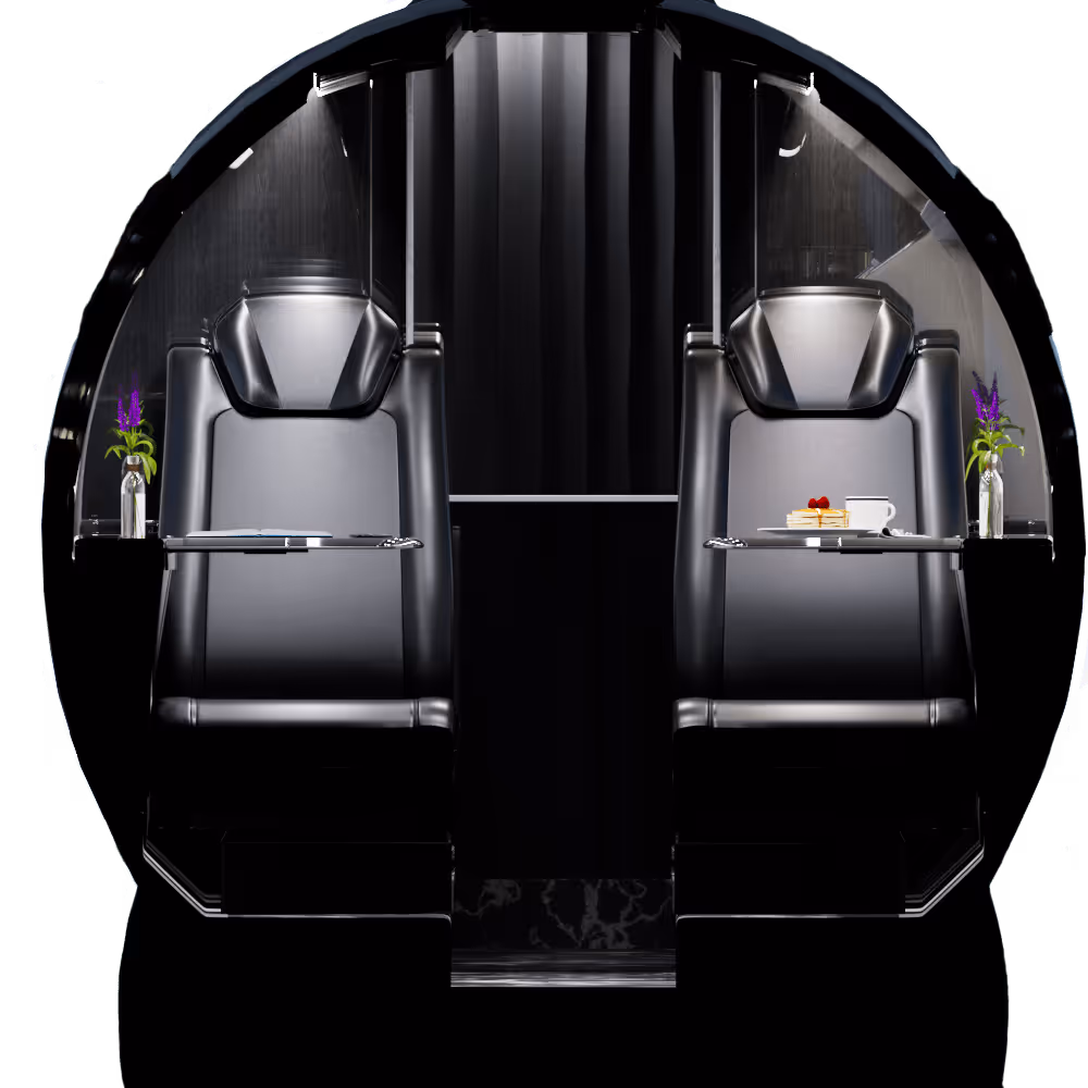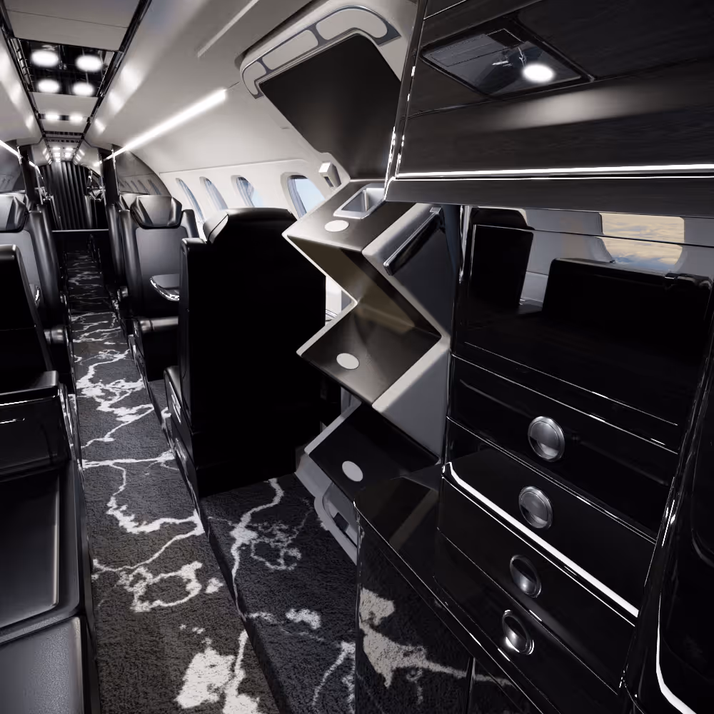 Club seating for four,Enclosed lavatory,Refreshment center,HD monitors,USB and 110V power,Wi-Fi,Oval windows,LED cabin lighting